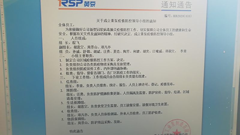 疫情防控是當前最重要的任務,而企業復工復產,疫情防控是基礎和保障。黃泵公司于2020年2月4號企業復工復產前成立了疫情防控領導小組,由公司董事長兼總經理程飛擔任組長,公司副總胡意空、支部書記周景山和人力行政總監兼支部委員鄧凡亭擔任副組長,并成立了五個專項小組:信息組、預防組、生活保障組、檢查組和物資保障組,確保企業復工后各項防控措施的落實。