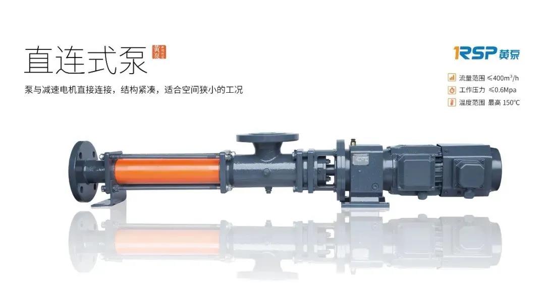 黃泵直連式單螺桿泵,泵體和減速電機直接連接,結構緊湊,所需安裝空間更小,重量更輕,維修拆卸更簡便。適合輸送有固體顆粒或纖維,流動性較好或一般的介質。