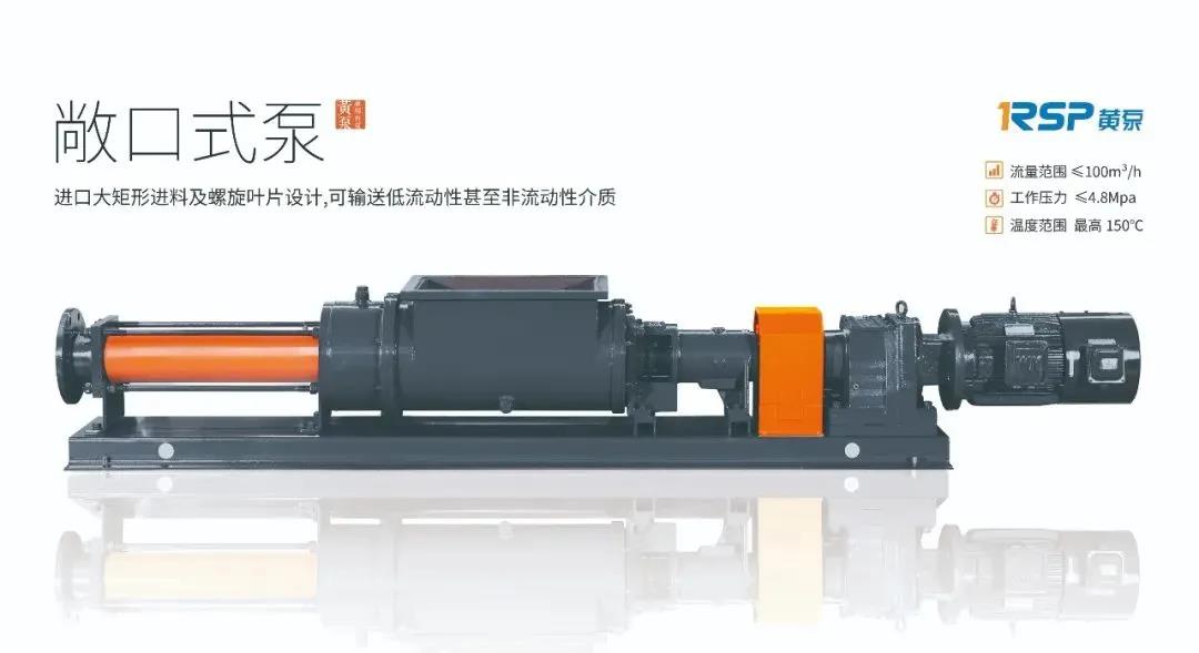 黃泵敞口式單螺桿泵進口腔體為矩形進料斗設計,內裝有進料螺旋葉片,可輸送高粘度、流動性差或非流動性介質,如脫水污泥等。
