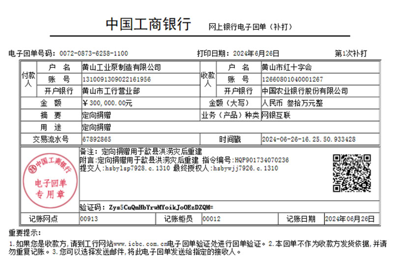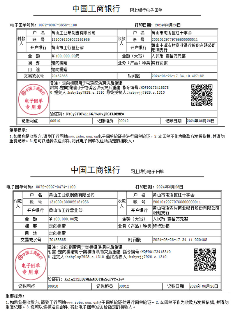 RSP黃泵向屯溪區紅十字會、黃山市紅十字會共計捐贈500000元,分別用于定向援助屯溪區及受災最嚴重的歙縣,開展抗洪救災和災后重建。